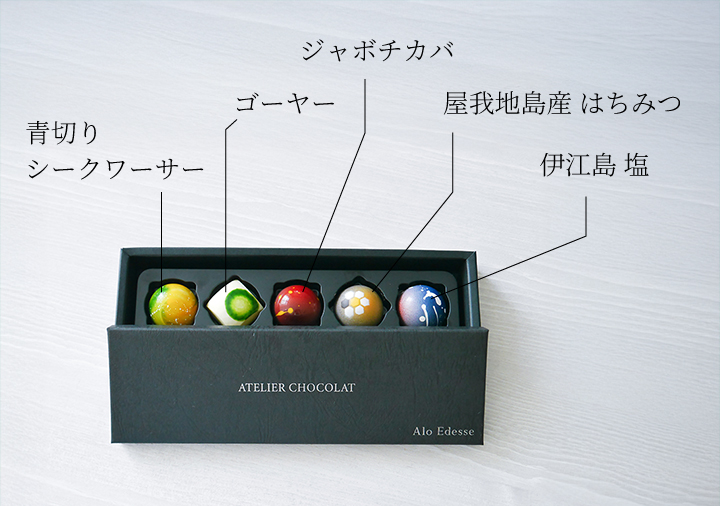 <ゴーヤー/ライム> 旬を迎えた色鮮やかなゴーヤーのジュレ、沖縄県産ライムと濃厚なホワイトチョコレートの素敵なマリアージュ。爽やかな酸味と心地よい苦みが溶け合います。 <伊江島 塩> 伊江島の海水を 新月・満月・満潮時に汲み上げ釜で炊き上げた塩を使用したガナッシュにヘーゼルナッツジャンドゥーヤを合わせました。 <青切りシークワーサー> 完熟前、爽やかな酸味広がるシークワーサーをジュレにしホワイトチョコレートの甘みと余韻をお楽しみいただける一品です。 <屋我地島産 はちみつ> センダングサとシークワーサーの花から集めた密のジュレと金武町産の爽やかなレモンバジル香るホワイトチョコレートガナッシュが溶け合います。自然養蜂家"おきなわ"bee happy"三浦大樹さんのはちみつを使用。 <ジャボチカバ> 鮮やかな亜熱帯果実。完熟の実を皮ごとジュレにして華やかな香りを閉じ込めています。