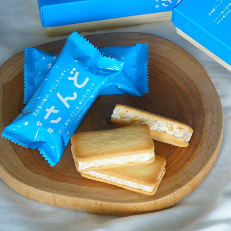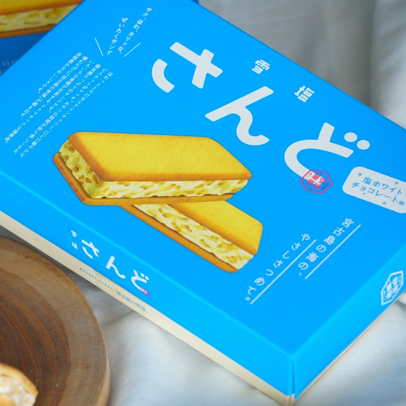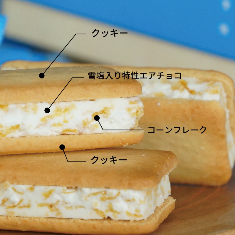 コーンフレークを練り込んだミルク風味のエアチョコをクッキーではさんだ、「サクッと」やわらかな食感が楽しめる 新しいお菓子。まろやかな甘さとコク、そして雪塩ならではの甘じょっぱさがクセになる満足感たっぷりのサンドクッキーです。