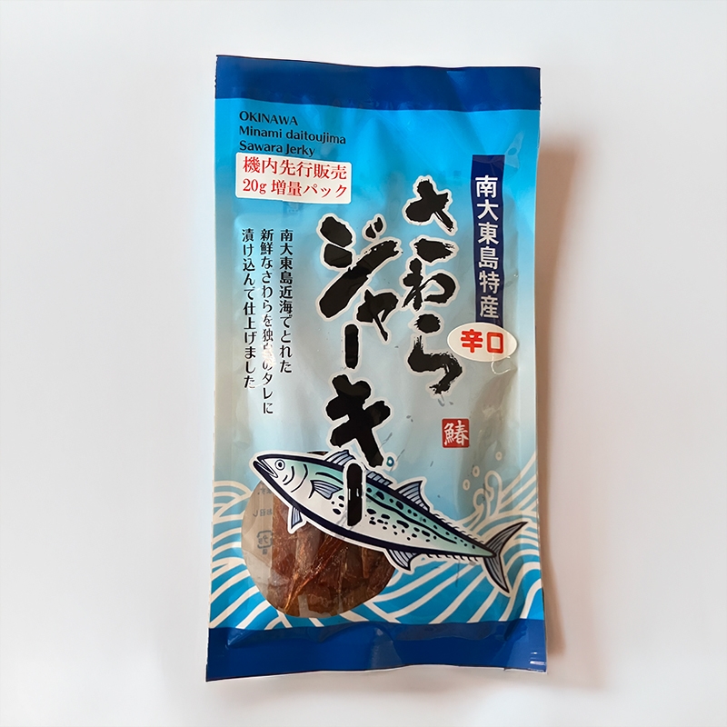 南大東島近海で獲れるさわらを使用し、 独自のタレに漬け込み一晩かけて燻製したジャーキーです。 島唐辛子のピリッとした辛味がアクセントとなり、おつまみにもおすすめです。 軽く炙ることで香ばしさが増し、より柔らかな食感が楽しめます。