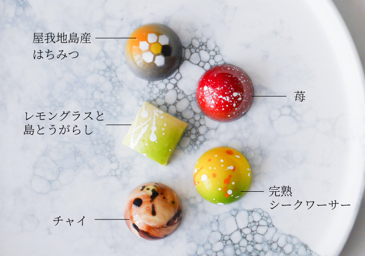 <完熟シークワーサー> ほのかな甘さと 爽やかな酸味 名護勝山産シークワーサーの完熟した果汁をジュレにし一粒に詰め込みました <屋我地島産 はちみつ> センダングサとシークワーサーの花から集めた蜜のジュレと金武町産の爽やかなレモンバジル香るホワイトチョコレートガナッシュが溶け合います。 自然養蜂家 “おきなわbee happy” 三浦大樹さんのはちみつを使用。 <苺> 名護市“まんまるファーム”さんの苺と南城市産無農薬ハーブ“パルマローザ”の香りを合わせました。甘酸っぱい苺とバラのような香りのパルマローザをお楽しみください。 <レモングラスと島とうがらし> 県産レモングラスの香りをジュレに仕立て後味にピリッとやんばるの島とうがらしの余韻を残しています。 <チャイ> 金武町産茶葉を使用したチャイティーをミルクティー風味にしアーモンドをしのばせました。フランス“ヴァローナ社”35%カカオを使用。