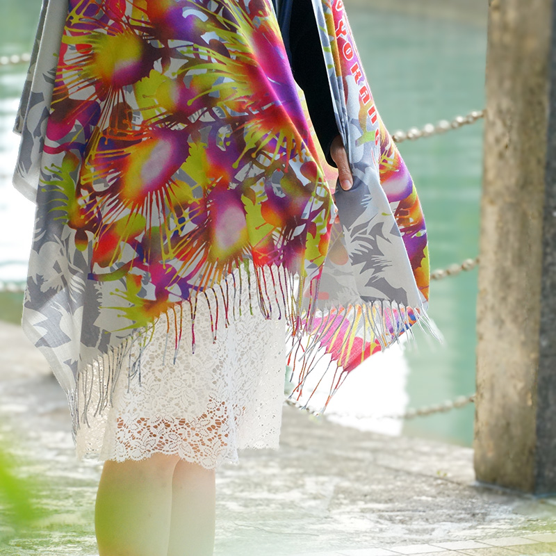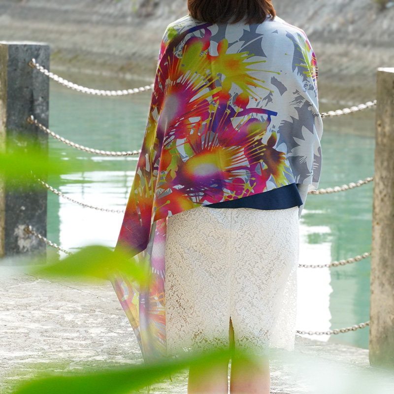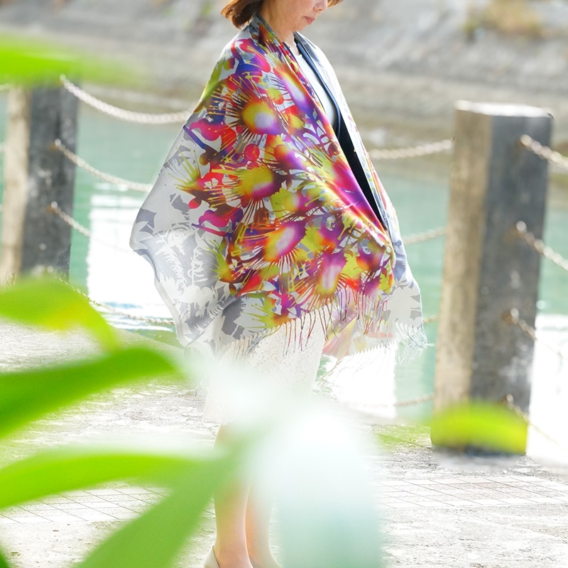 カシミヤのように滑らかで上質な肌触りの大判ストールです。幻想的なサガリバナをモチーフにした「サガリバナ柄」をご用意しました。お洋服を華やかにするアクセントとしていかがでしょうか。