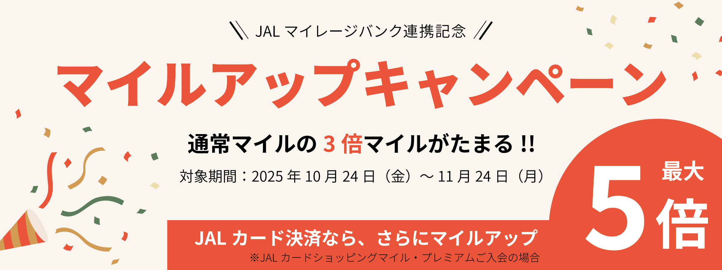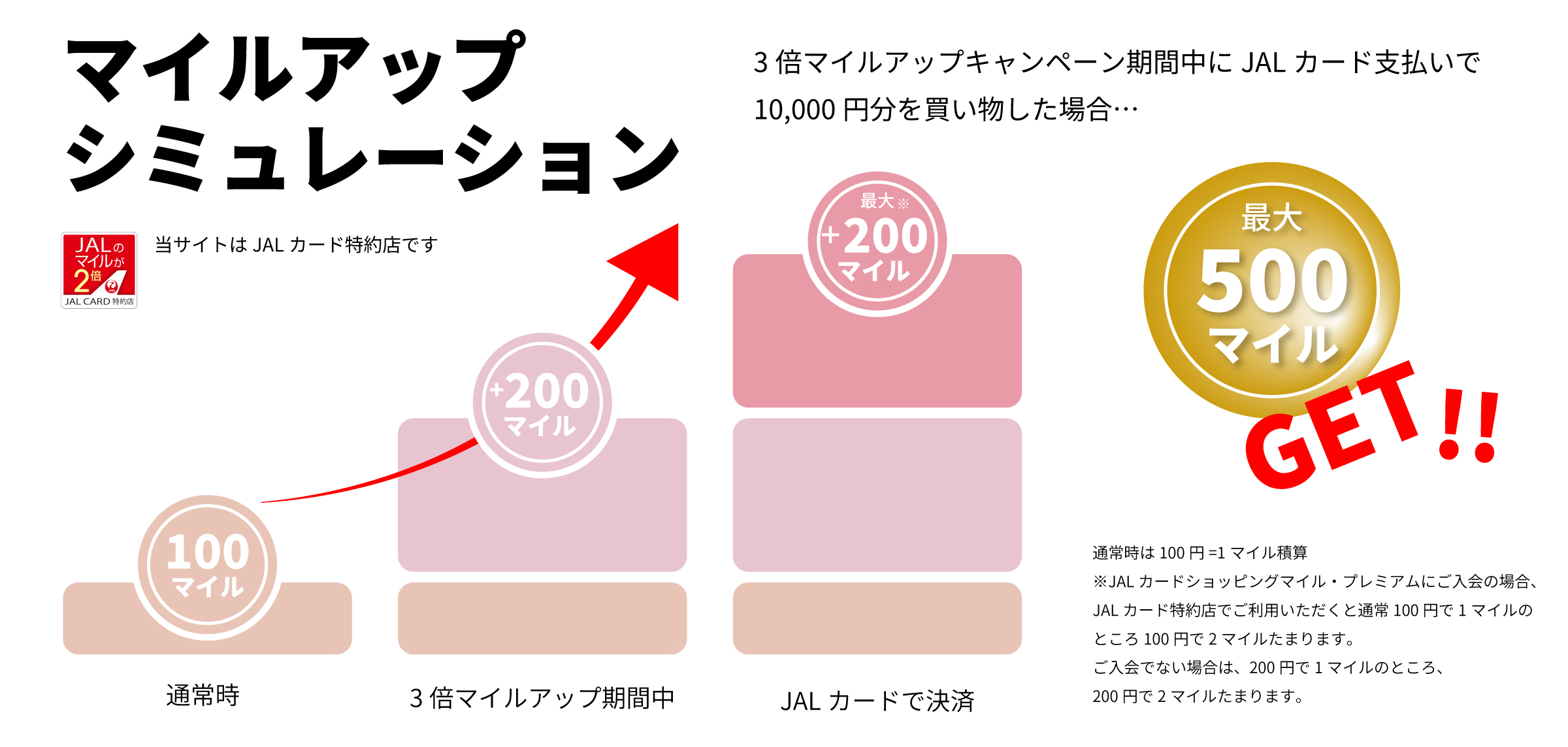 JALカードで決済いただくと、100円=最大5マイル(※)積算されます。