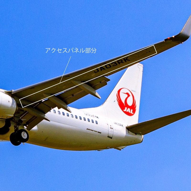 旅客機の翼の下にひっそりと佇み、旅客機の翼の下にひっそりと佇むアクセスパネル。