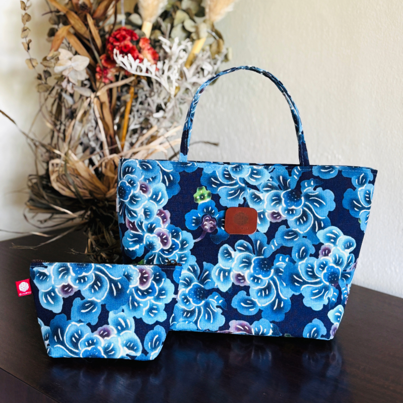 沖縄らしいハイビスカスをモチーフにしたランチトートバッグとポーチのセットです。