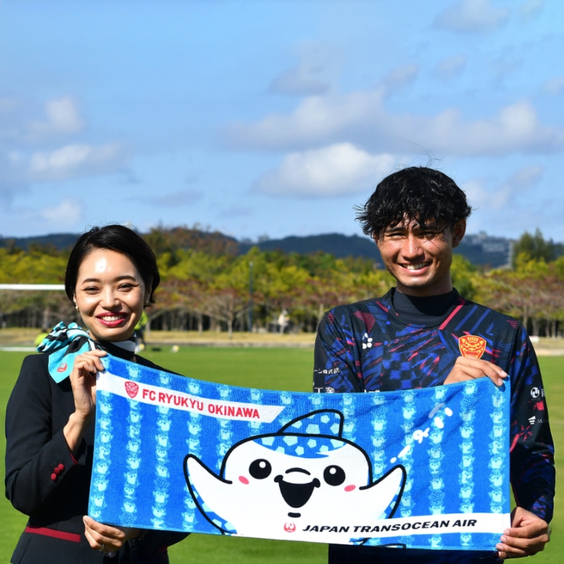 FC琉球の人気キャラクター「ジンベーニョ」と、JTAがコラボした限定デザインタオル!