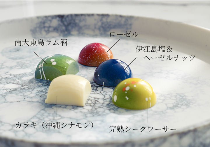 春夏秋冬、季節ごとに旬の食材を使用し、沖縄の風景が目に浮かぶようなアーティスティックなボンボンショコラをぜひお楽しみください。