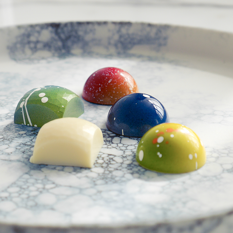 ショコラティエールの水本さんが約2ヶ月に1度のペースでテイストを変えた5種類の半ドーム型のチョコレートを作り出しています。