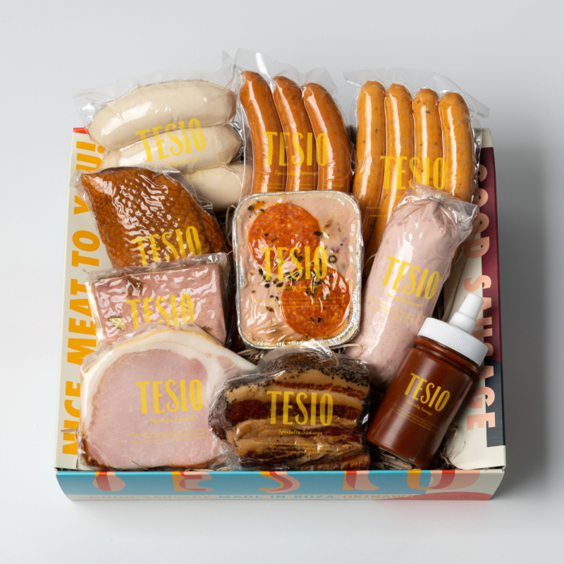 沖縄市の中心市街地、通称『コザ』に店舗を構えるTESIO(テシオ)。 店名の「TESIO(テシオ)」は「手塩に掛ける」が由来。 沖縄県産の豚肉を中心にドイツ製法で毎日手作りでハムやソーセージを作っています。 ドイツで140年以上の歴史のある食肉加工の国際見本市「IFFA(イファ)」のコンテストにおいて、2025年も3商品が最高評価「GOLD(金賞)」を受賞。 過去3回の挑戦で合計8品、TESIOの職人全員が受賞し、まさに世界が認めたシャルキュトリー専門店です。