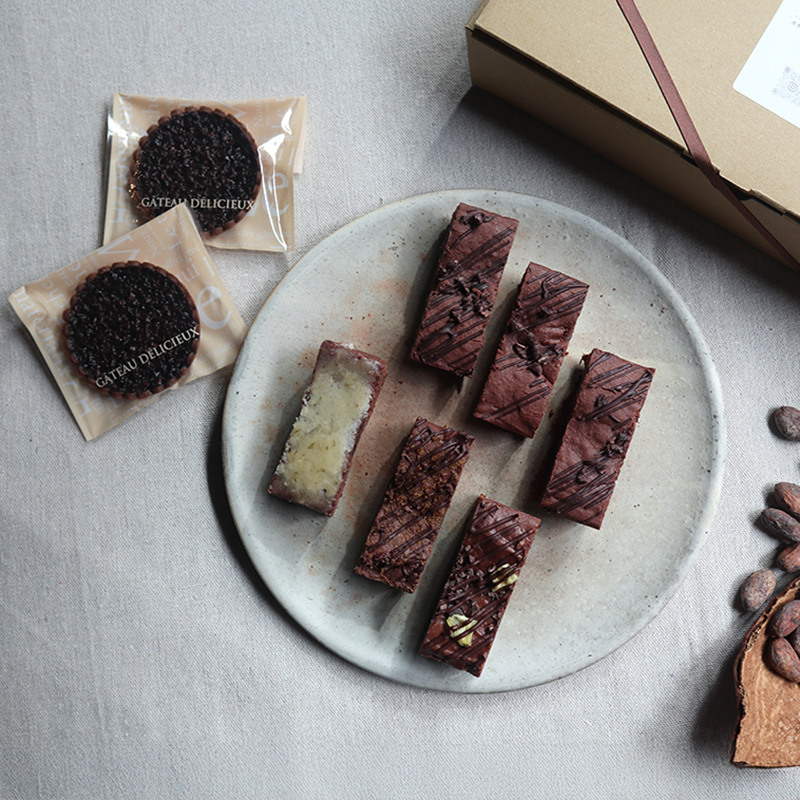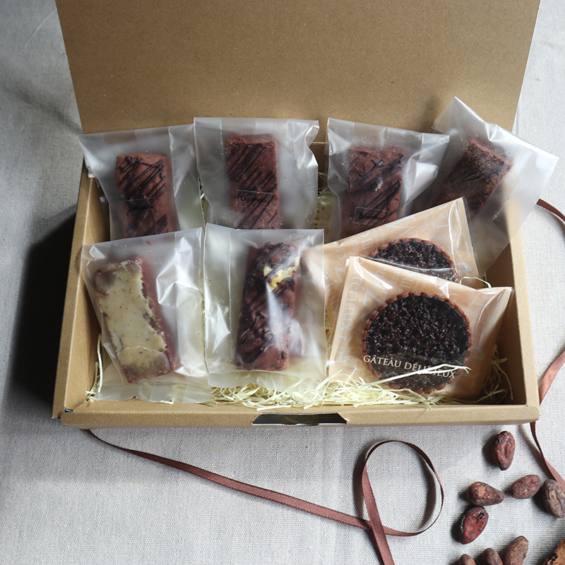 【沖縄ブラウニー】 ●ブラウニー(ウガンダ×多良間産黒糖×カラキ) ずっしりとした重厚感のあるウガンダ産のカカオ豆に合わせるのは、多良間産黒糖とカラキ(沖縄シナモン)。 ●エクアドル×シークヮーサー×月桃 ラベンダーのような華やかでエレガントな香りのエクアドル産のカカオ豆に合わせるのは、沖縄のシークヮーサーと月桃。 ●タンザニア×パイナップル×ミントマリーゴールド フルーツのようなキュンとした酸味が特徴のタンザニア産のカカオ豆に合わせるのは、 沖縄のパイナップルとミントマリーゴールド。 【ベーシックブラウニー】 トップには、カカオニブがついていて、カリッと食感と香りを引き立ててくれます。 産地別で、3種類(エクアドル・ウガンダ・タンザニア)がございます。 3種類の食べ比べもオススメです♪ ●ウガンダ 重厚感のあるウガンダ産のカカオでつくるブラウニーは、 ほんのりコーヒーのような香りも感じつつ、チョコレート感もしっかり、王道のブラウニー。 コーヒーとの相性は抜群! ●エクアドル エクアドル産カカオのもつ華やかな香りはふんわりと広がるブラウニー。 紅茶やワインと香りとペアリングするのもオススメです! ●タンザニア タンザニア産カカオのフルーティーな酸味でチーズケーキを思わせるようなブラウニー。 カフェラテやカカオハスクティーと組み合わせもオススメ! 【ショコラフロランタン】 エクアドル産カカオニブとカカオハスクをあわせた、特別なショコラフロランタン。 薄く焼き上げたサブレとキャラメルヌガーの絶妙なバランス。 ヌガーの甘さに、カカオニブのほろ苦さと豊かな香りが重なり、思わずもうひとつ手を伸ばしたくなる味わいです。 カカオの香りをしっかりと感じられるよう、何度も調整を重ねいただき、完成した商品です!