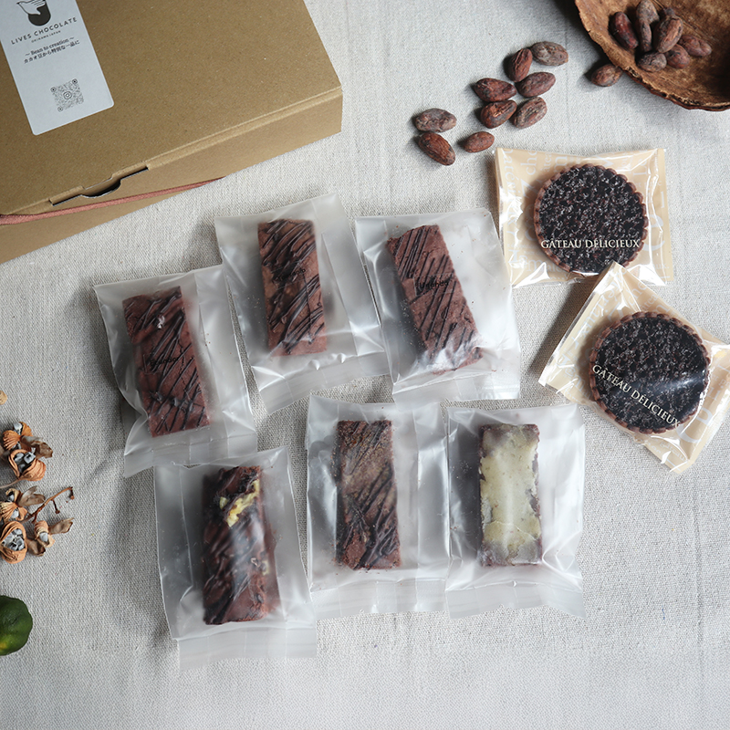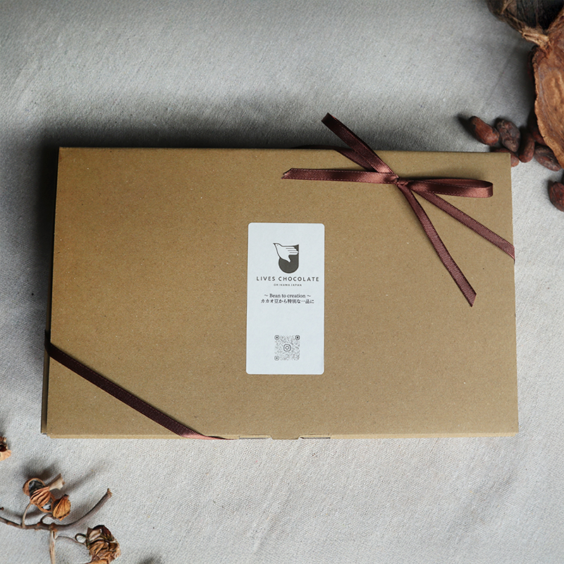 沖縄県沖縄市にBean to Barチョコレートの工房を構える「Lives Chocolate」 カカオと沖縄の豊かな素材を融合させたブラウニーとフロランタンをフギフトボックスに詰め合わせました。 ブラウニーは、カカオ豆から丁寧につくったBean to Bar チョコレートをたっぷりと使用した 濃厚なカカオの味わいと複雑なアロマが織りなす贅沢な一品です。