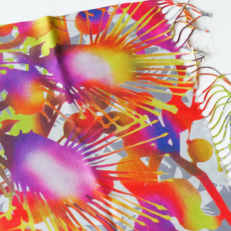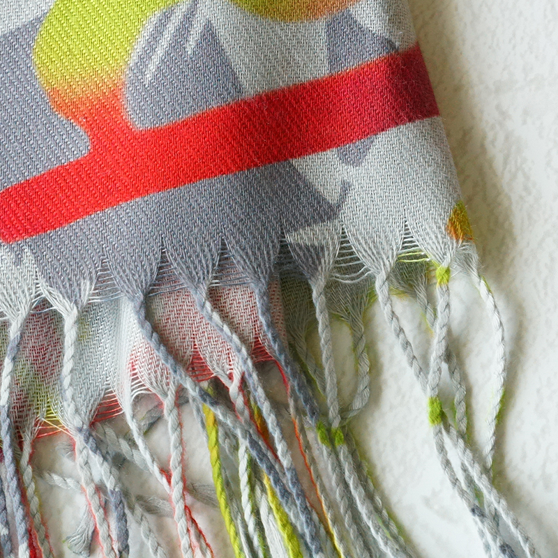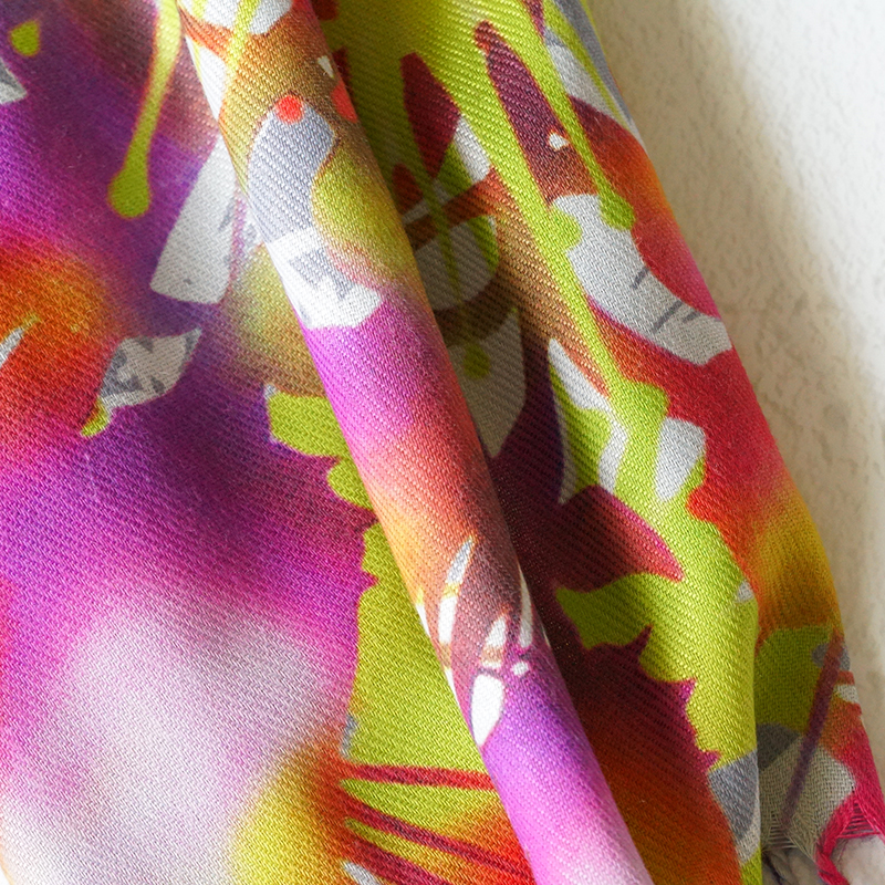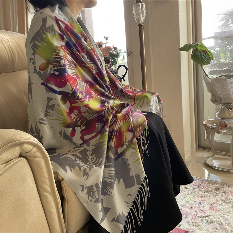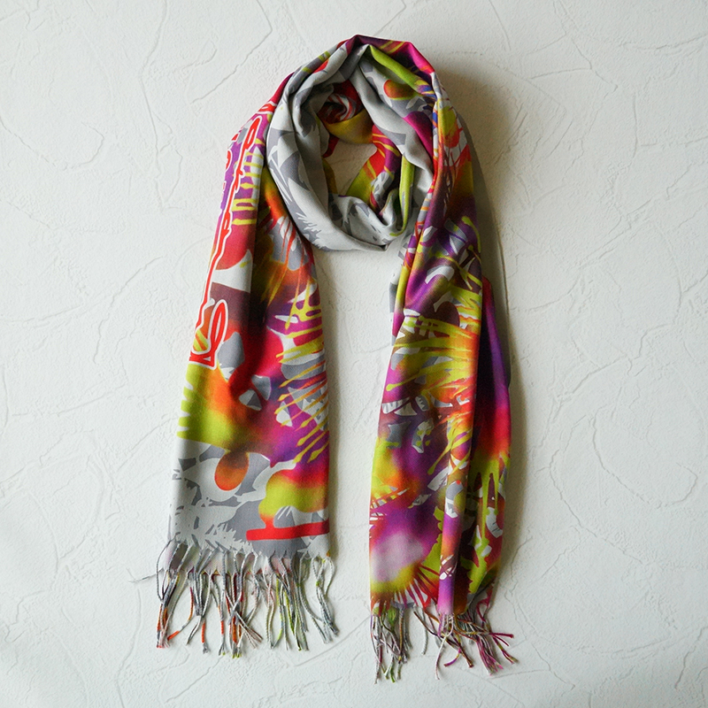 カシミヤのように滑らかで上質な肌触りの大判ストールです。幻想的なサガリバナをモチーフにした「サガリバナ柄」をご用意しました。お洋服を華やかにするアクセントとしていかがでしょうか。